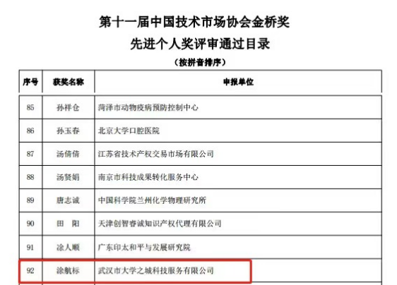 公司成功入选为武汉市洪山区科技孵化器协会秘书长单位、洪山区大学之城技术转移联盟秘书长单位、国家技术转移中部中心十佳基层站点。